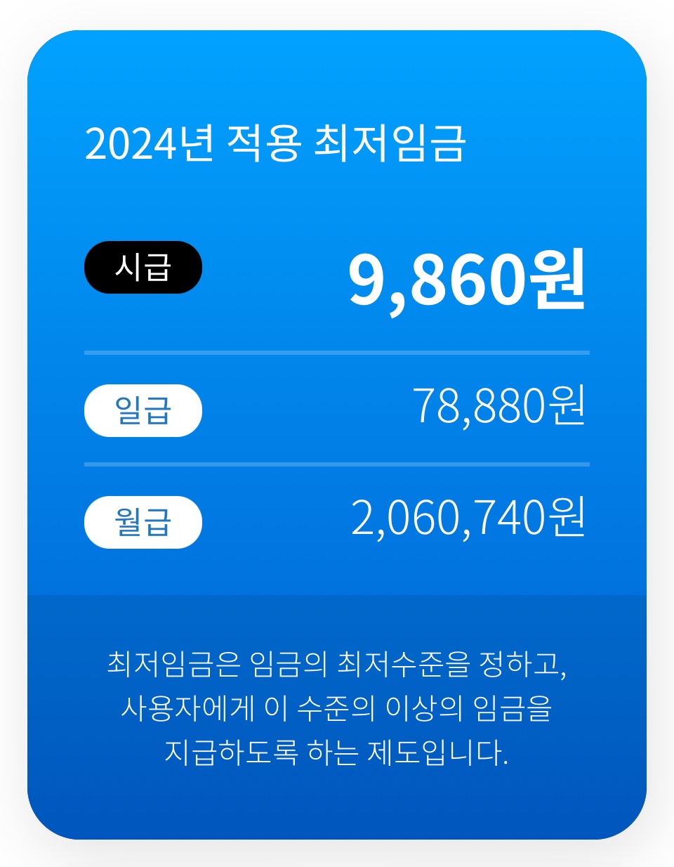 2024년 기준으로 최저임금액은 시간당 9,860원입니다.