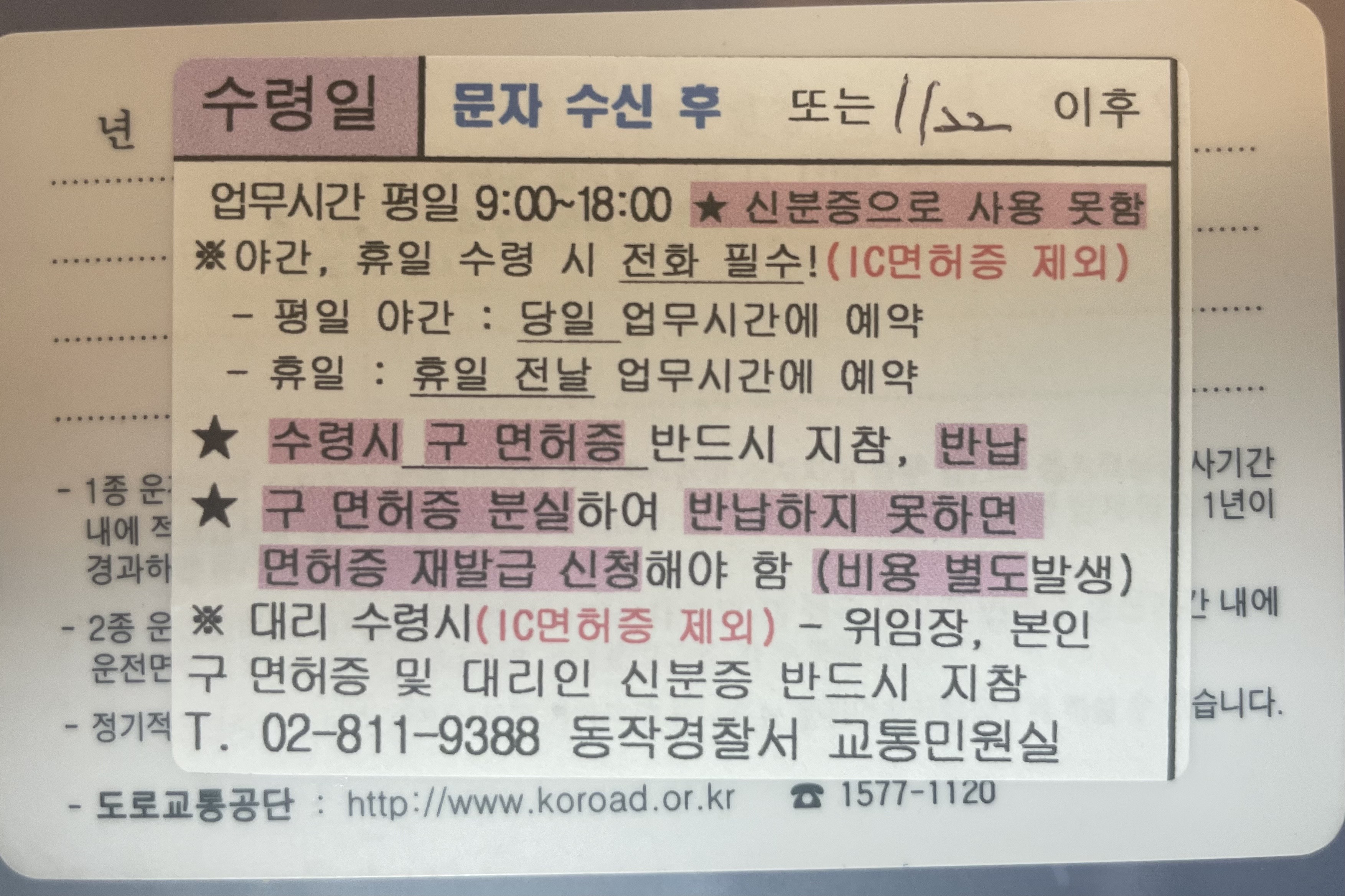 아래쪽 안내아저씨에게 맡겨둘테니 새면허증을 찾아가라 말씀해주셨다.
