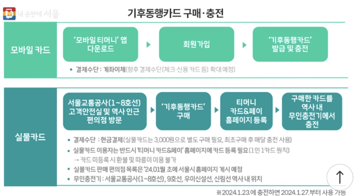'기후동행카드'는 2024년 1월 27일부터 시작되는 서울시의 새로운 대중교통 정기권입니다.