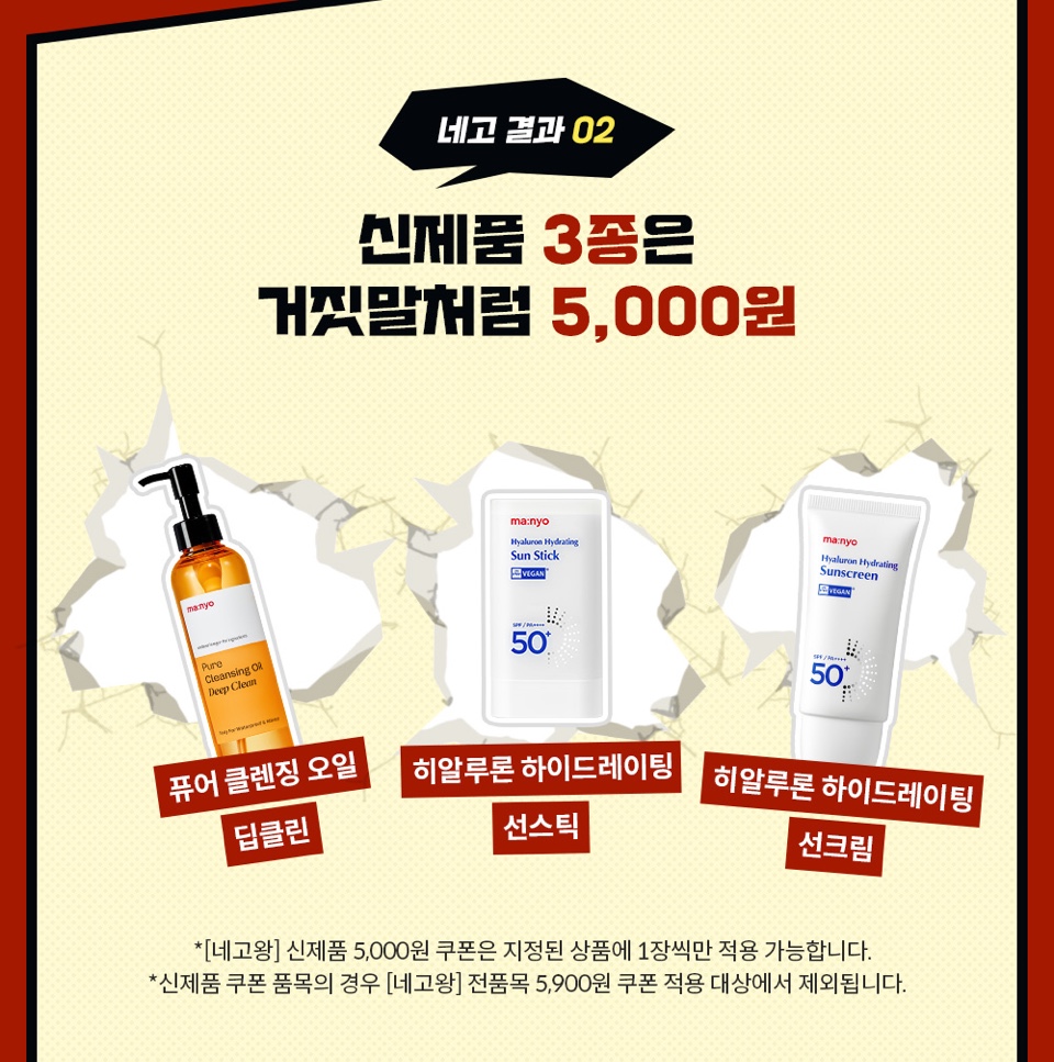 (신제품 쿠폰 품목: 퓨어 클렌징 오일 딥클린, 하이드레이팅 모이스처 선크림, 하이드레이팅 모이스처 선스틱) 신제품 쿠폰 품목의 경우 [네고왕] 전 품목 5,900원 쿠폰 적용 대상에서 제외됩니다.