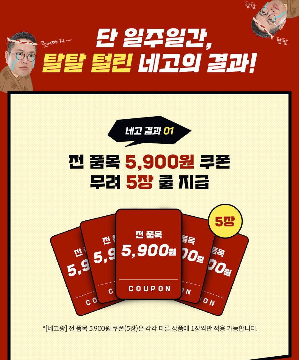 -[네고왕] 전 품목 5,900원 쿠폰(5장)은 각각 다른 상품에 1장씩만 적용 가능합니다.